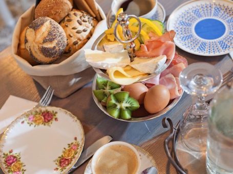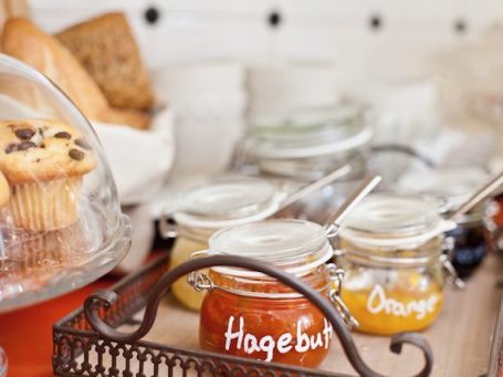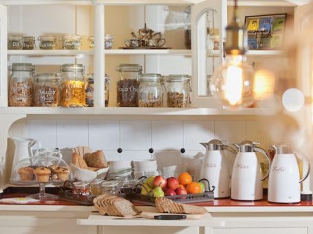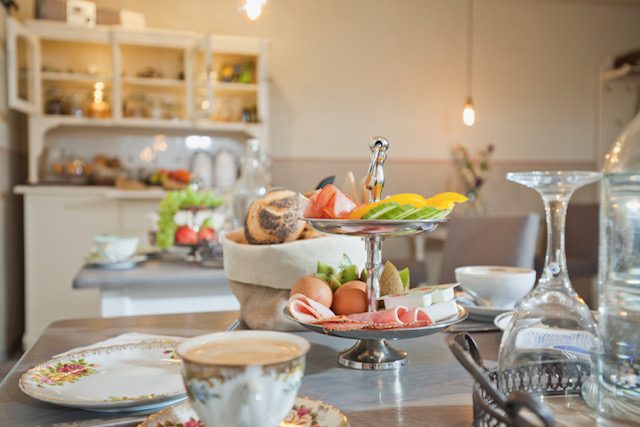 Genießen Sie Ihr auf Etageren angerichtetes Frühstück im gemütlichen Frühstücksraum mit Blick auf den Garten.