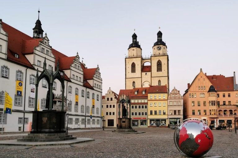 Ein schöner Marktplatz mit dem Rathaus (einem massiven weißen stattlichen Gebäude mit rotem Dach) und den Statuen von Martin Luther und Philipp Melanchthon. Sie lehrten an der Universität Wittenburg,